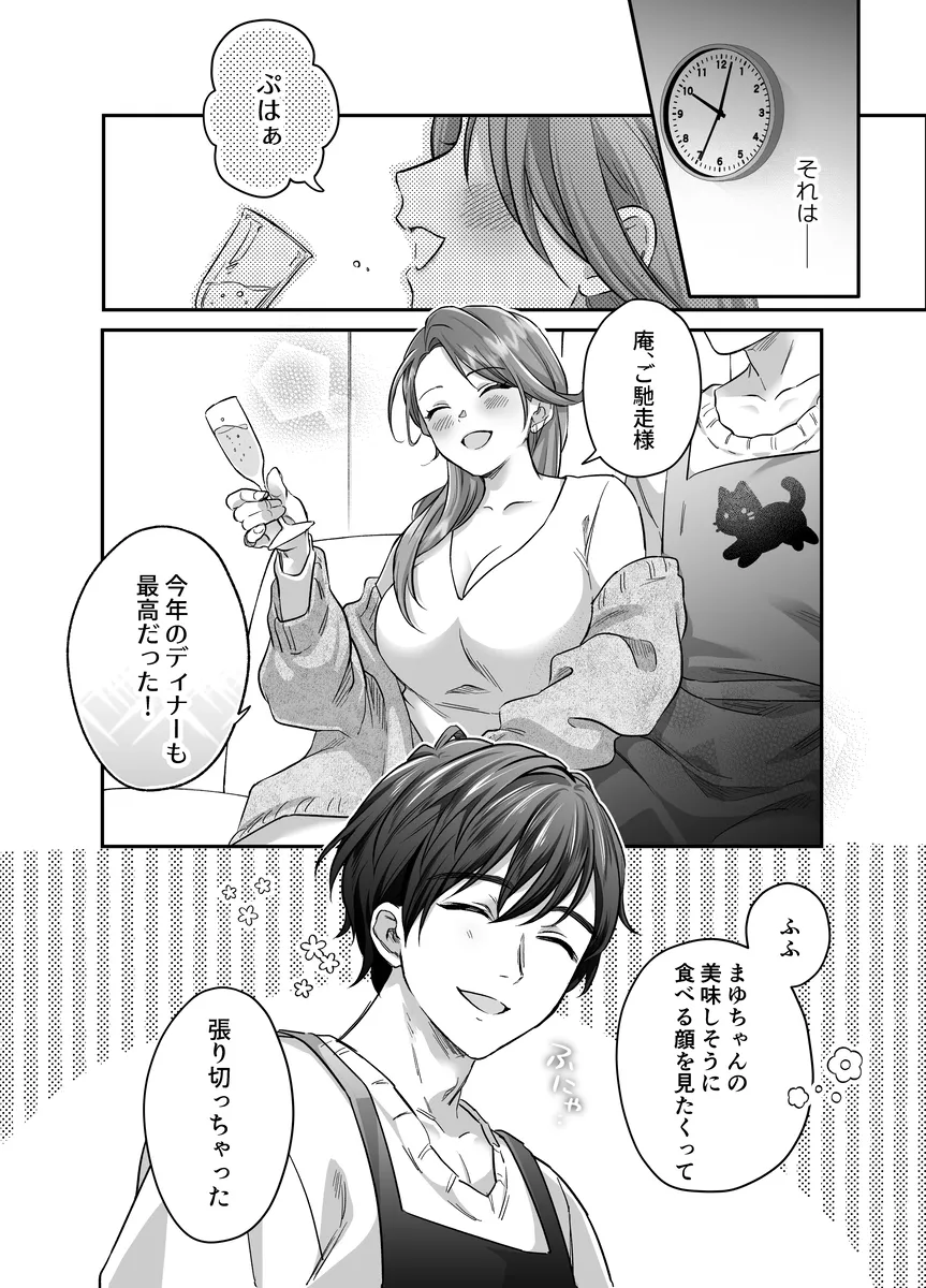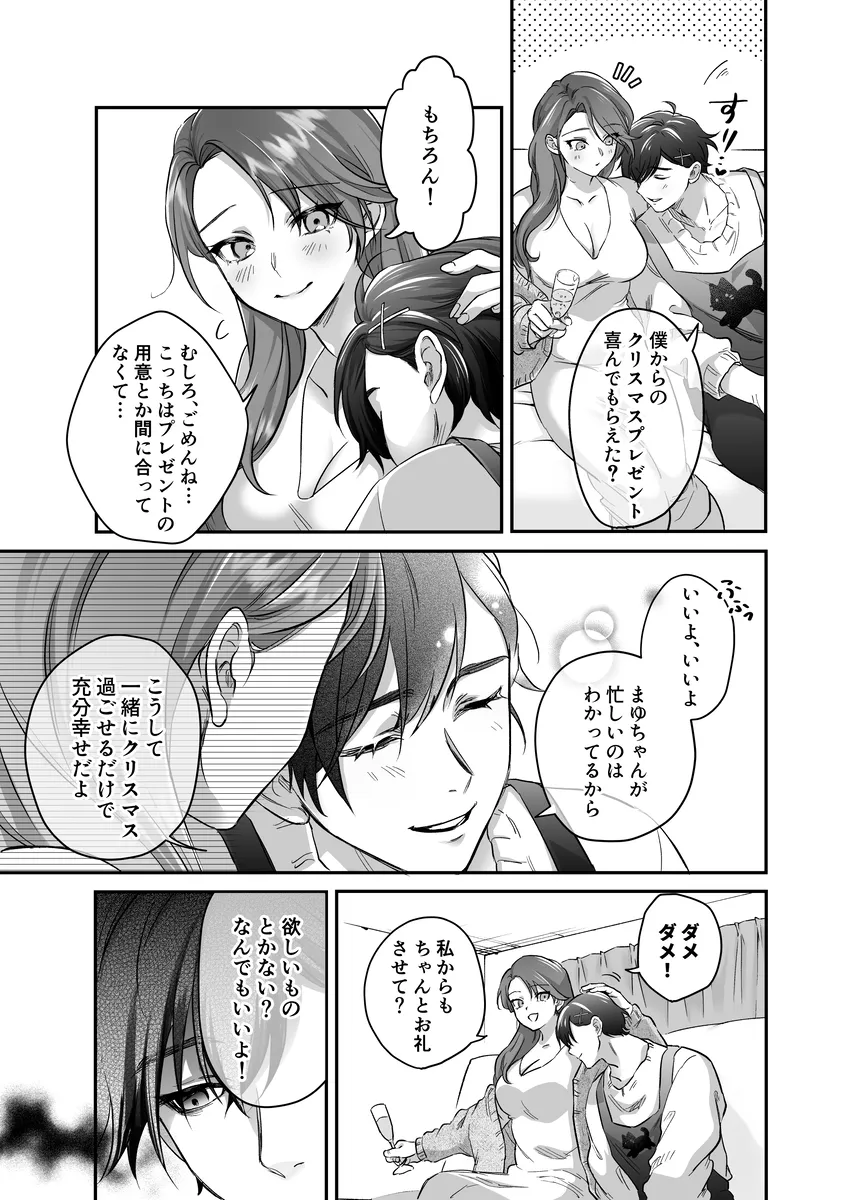 クリスマスイヴの日、仕事を切り上げて帰宅を急ぐOLのまゆ。家には最愛の夫、庵が待っている。庵は高校時代からの付き合いでそのまま入籍。料理の腕はプロ級で専業主婦をしてくれている。しかしまゆはあることに悩んでいた。それは庵が疲れ知らずの絶倫巨根であるということ。「一つだけおねだりしていい?まゆちゃんのこと食べたい、だめ?」クリトリスを弄られてすぐにメス顔になるまゆ。「ド下品メス顔可愛い…いっぱい気持ちよくしてあげるね?」仰向けにされてチンポをお口に入れられる。ただただ、それに身を委ねるしかない。もちろん一発射精しただけでは終わらず…。