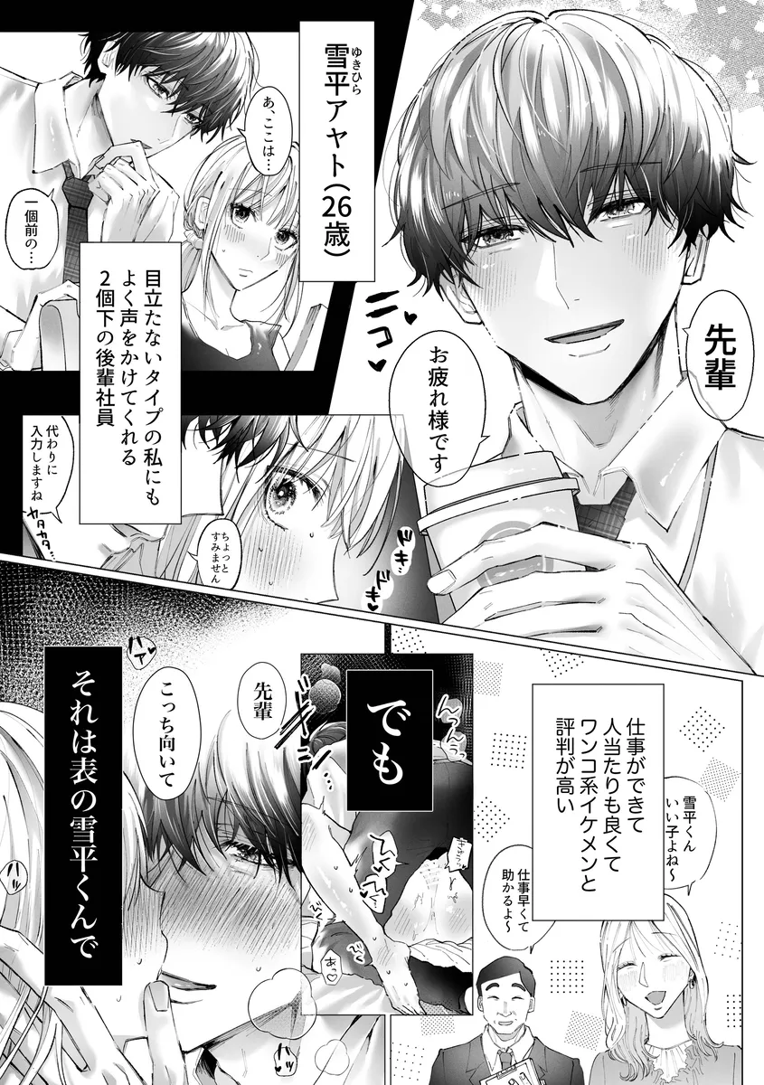 雪平アヤト26歳、会社では目立たないタイプのリノにもよく声をかけてくれる二個下の後輩社員。仕事が出来て人当たりも良くワンコ系イケメンと言われて周りから慕われている。しかしそれはアヤトの表の顔だ。実は裏ではリノとヤりまくる、本当はドSで絶倫のねちっこいやつ。それはリノだけが知っているアヤトの裏の顔。きっかけは少し前の会社の飲み会だった。酔っぱらったリノはついついアヤトを誘ってワンナイトをしてしまう。それから事あるごとに会社でセックスをして今では立派なセフレの関係に。いっぱいセックスをした翌日は、またただのちょっと仲の良い先輩後輩の振りをする…。