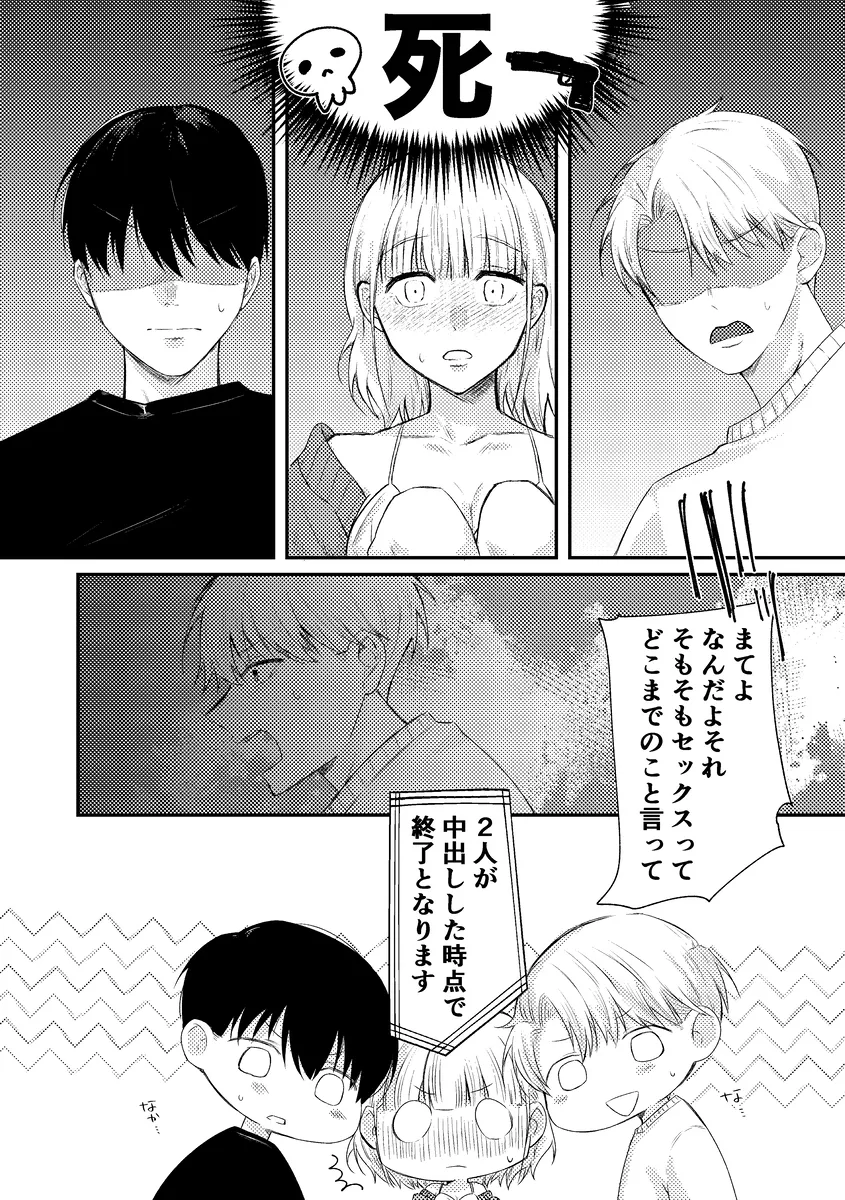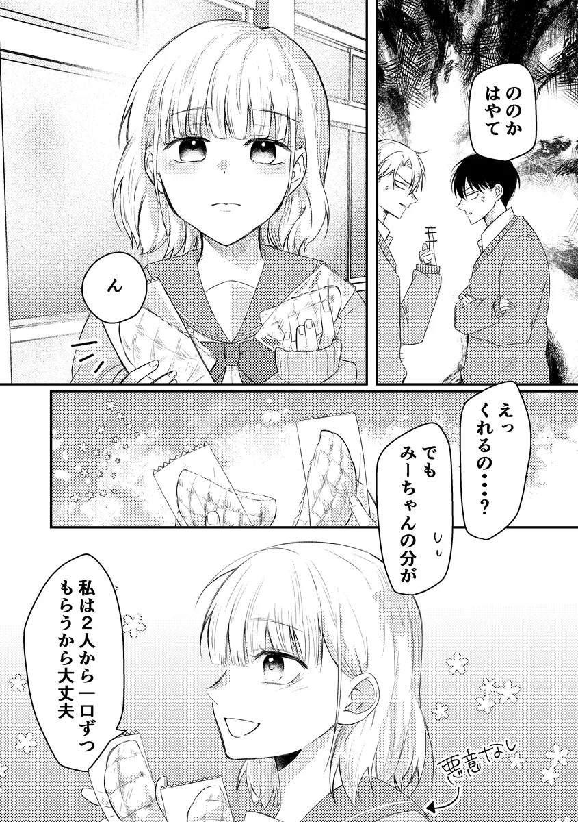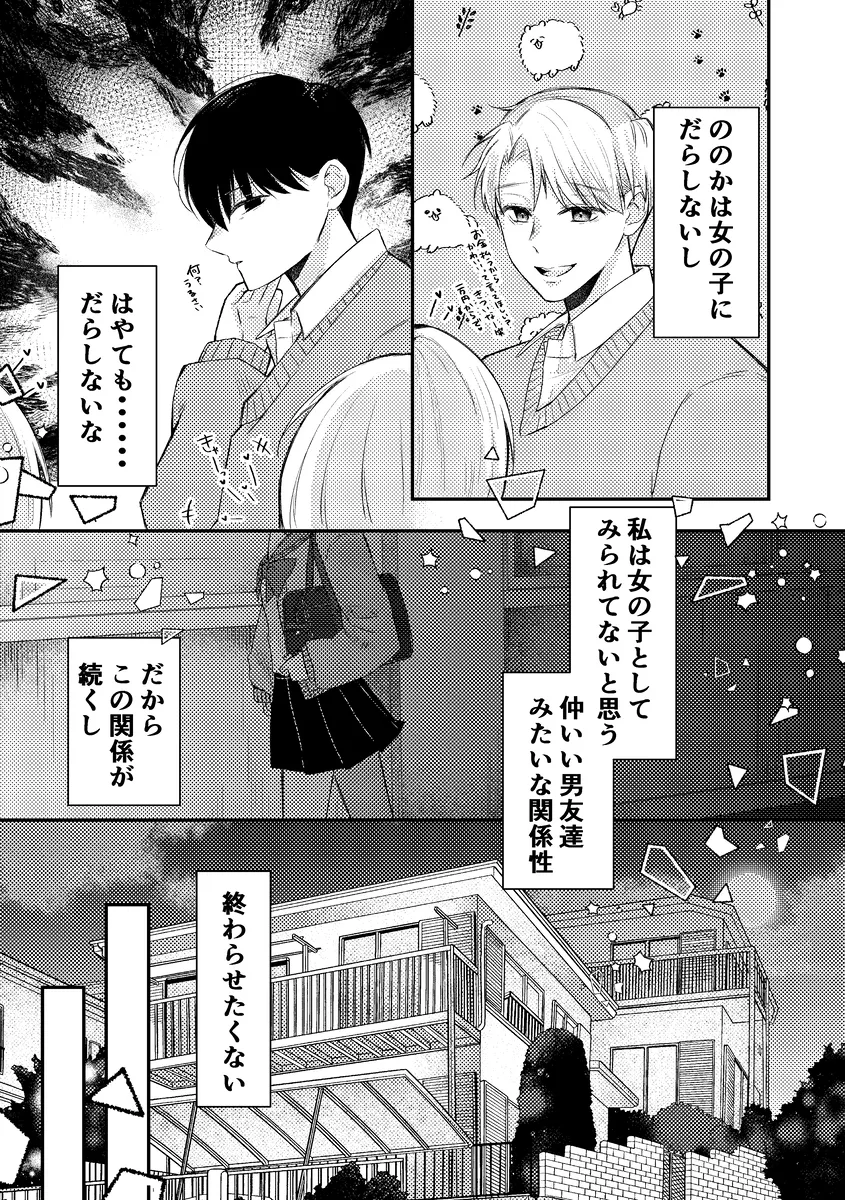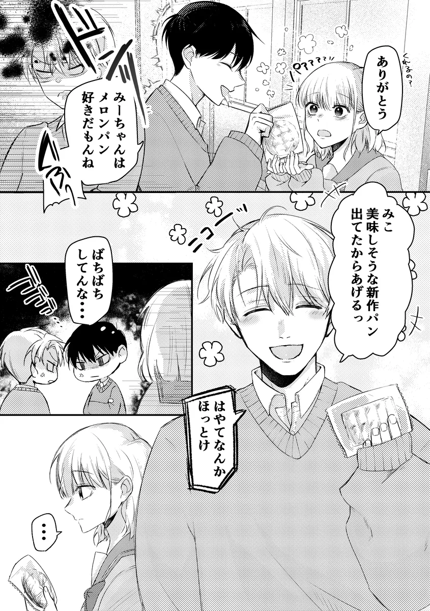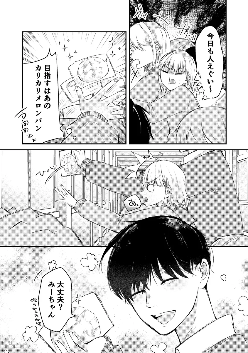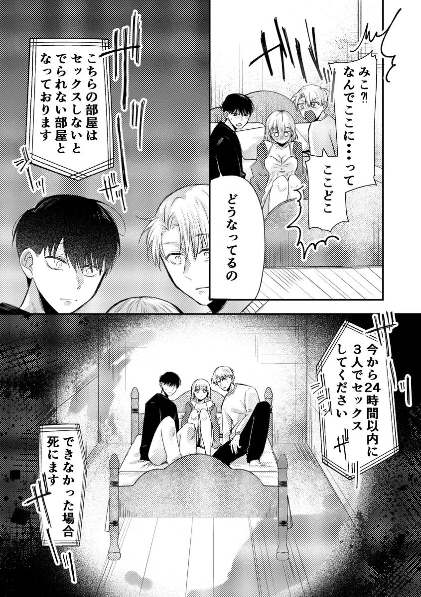 目指すはあのカリカリメロンパン。学校の売店向かうみこの前に現れたのはののかとはやて。二人は双子で仲の良い男友達。みこは二人の事を男として意識したことはなく、それだからこそこの関係が長く続いていた。二人は学校内でもイケメン双子として有名で、みこは女子たちからウザがられていたのだ。みこはこれからもこの関係が長く続けばいいと思っていた。そんな矢先、目を覚ますとベッドの上。隣にははやてとののかがいた。この部屋から出るためには三人でセックスをしないと出られない。セックスは中出しした時点で終了となり、もしセックスできなかったら…。