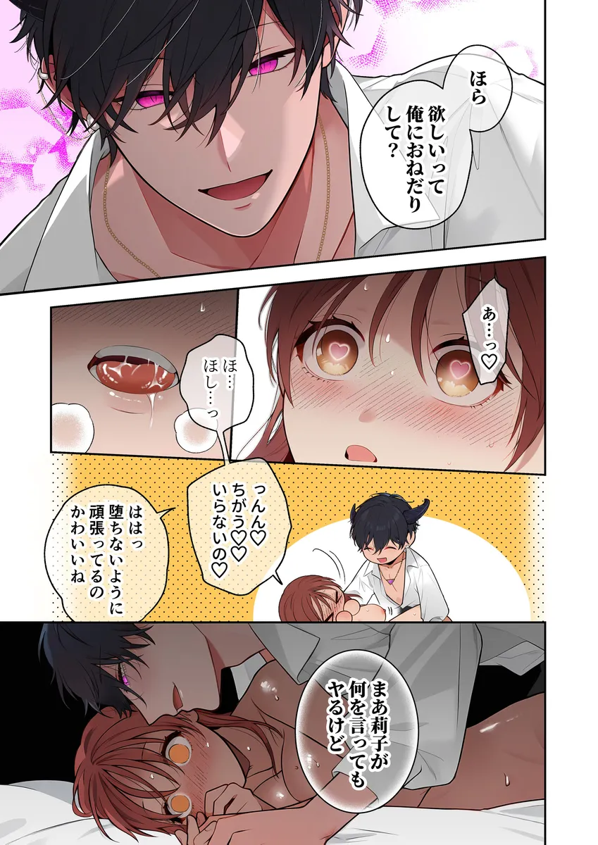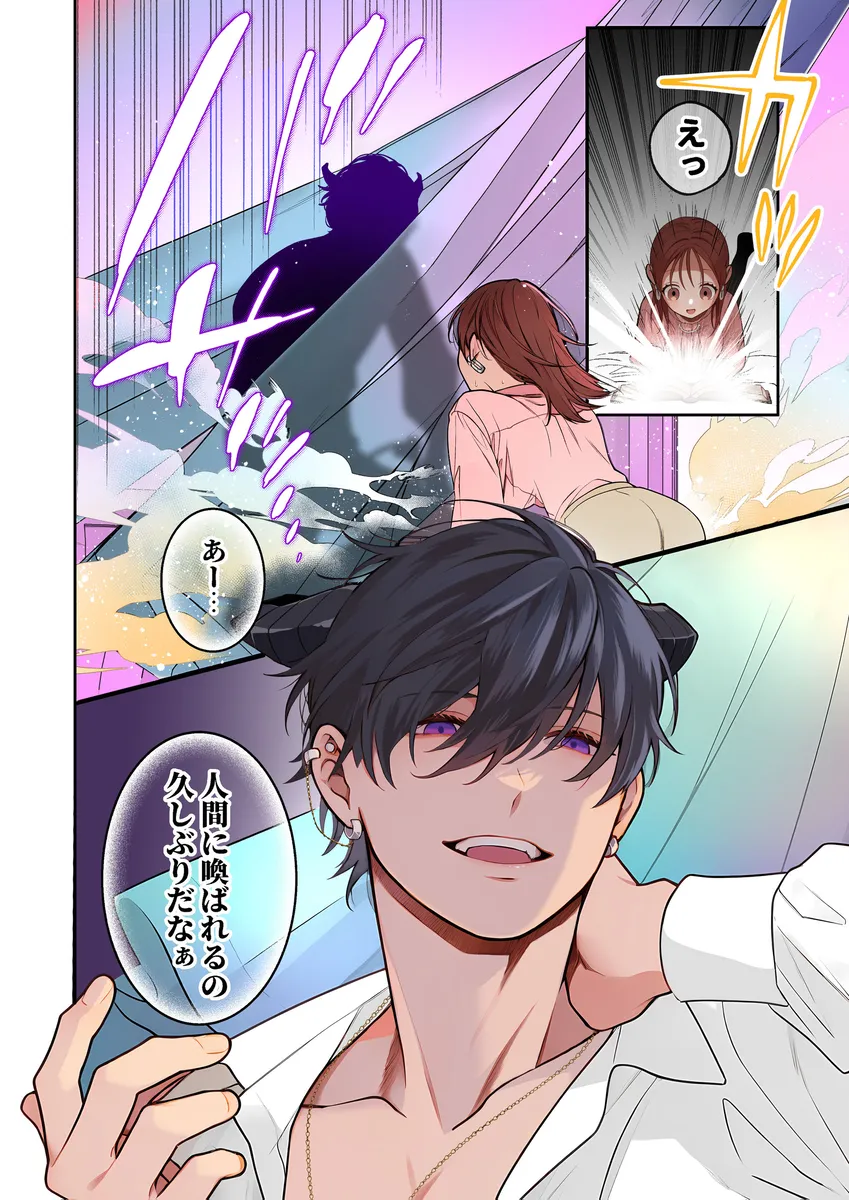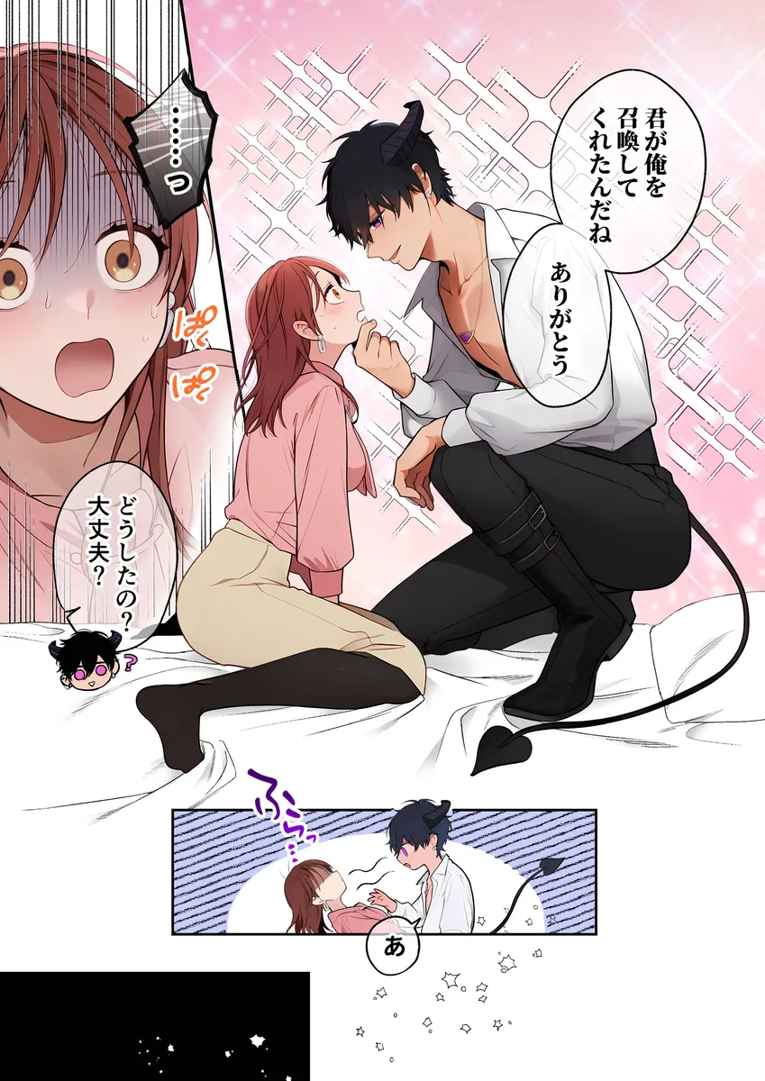 ほんの出来心だった。OLの莉子は疲れ切って帰宅。たまたま目についた本を手に取るとそこにはインキュバスの男が描かれていた。顔がいい悪魔にお世話されるのも悪くない、ここまで来てくれないかなと独り言を言うと、本が光って本当のそのインキュバスが召喚される。名前はシアラデル、通称シア。莉子は、対価として何を取られるのか不安になっていたが、シアが欲しているの精気のみ。ハグやキスでも精気はとれるが、一番いいのはセックスすることだ。俺とセックスしようかと言われて莉子は流されるままにOKしてしまい…。