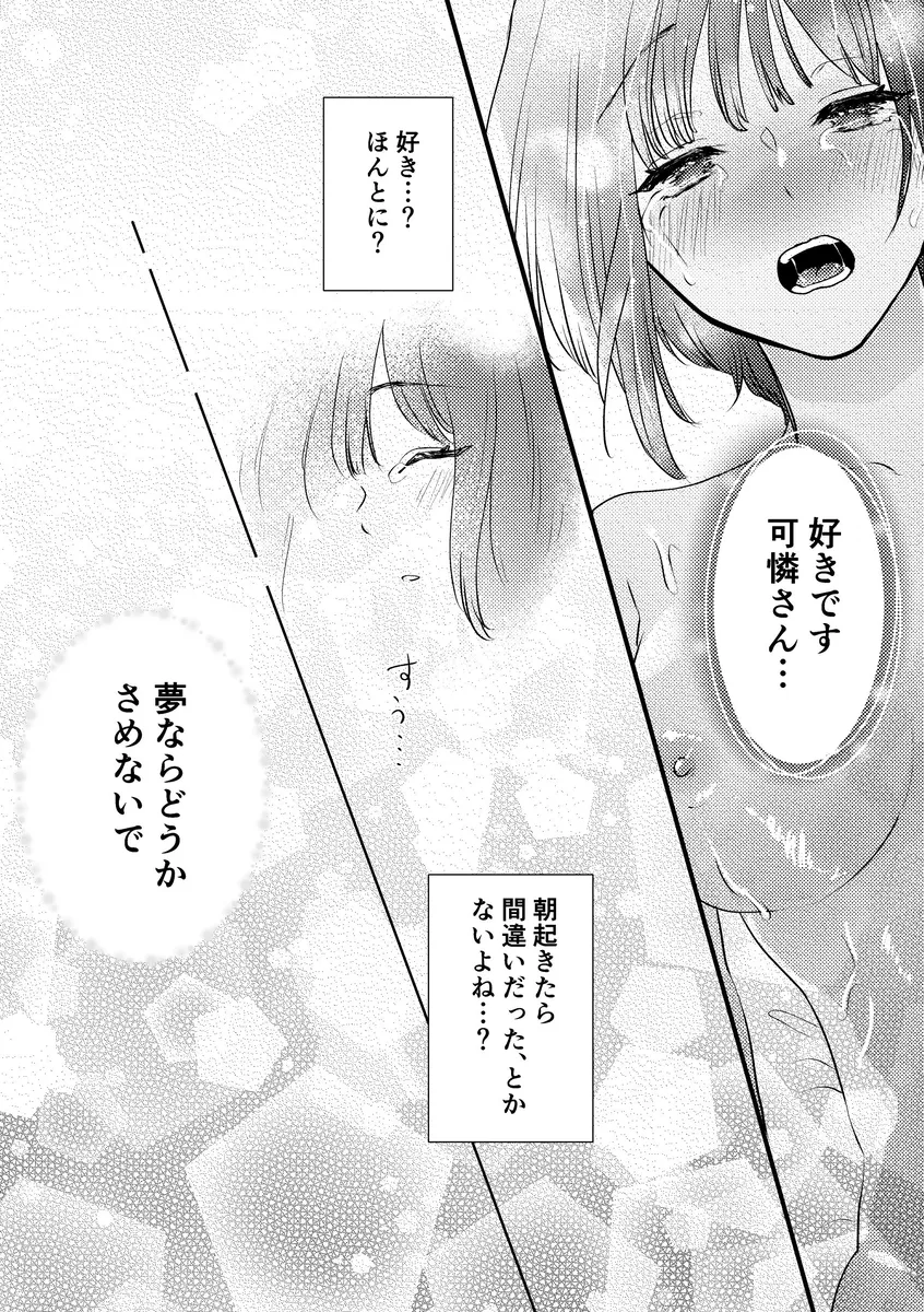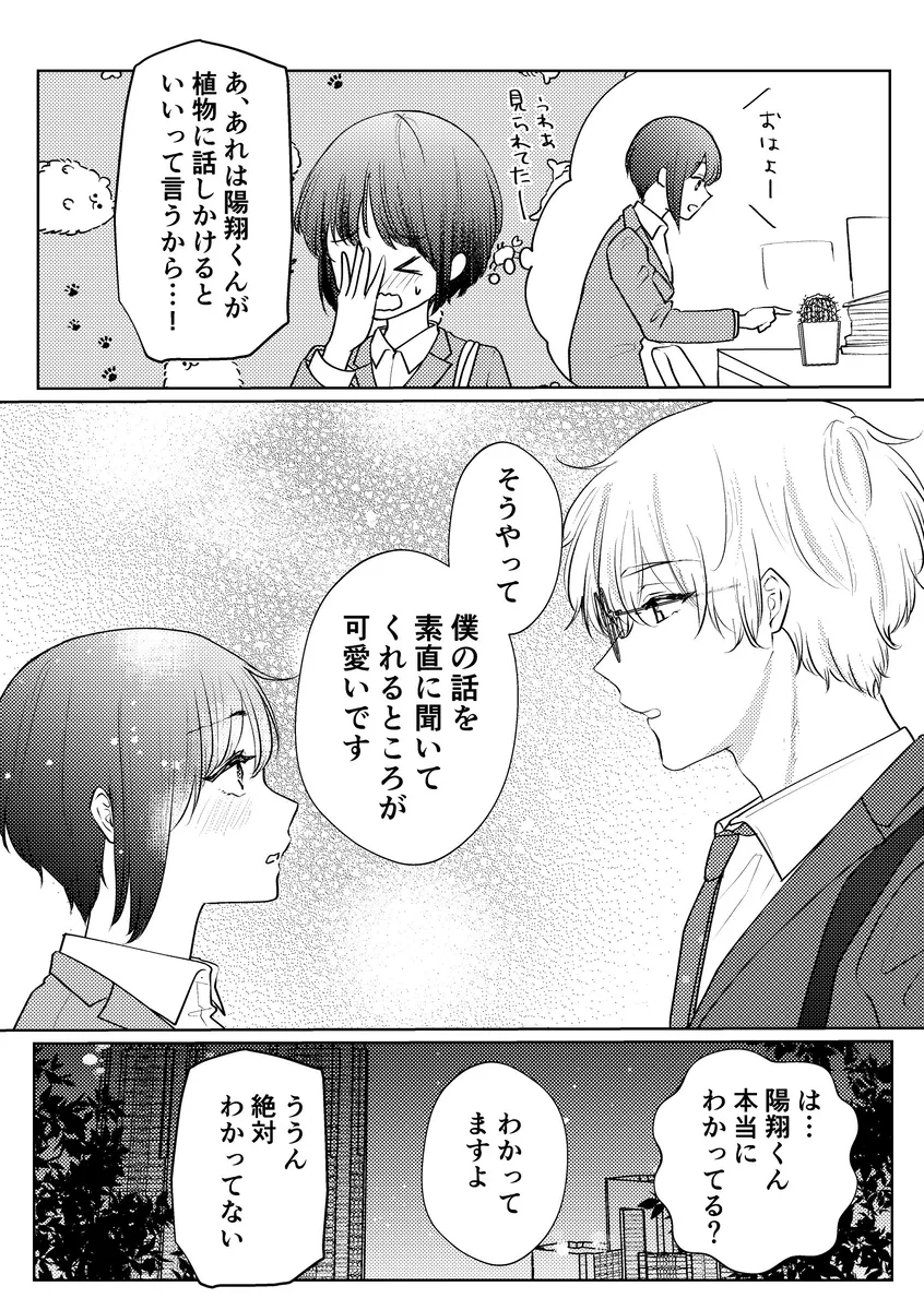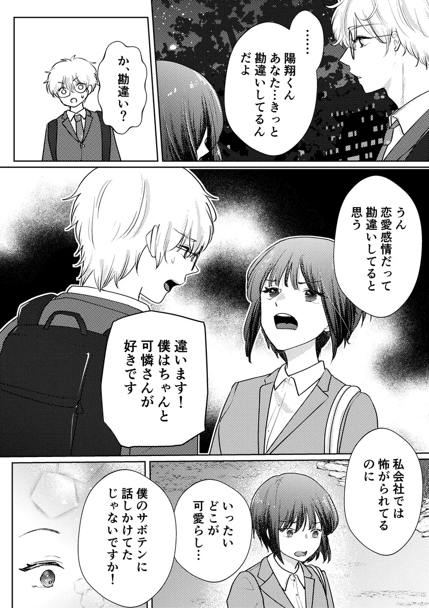 白雪可憐は彼氏無しのOLだ。彼氏には一人で生きていけそうだからなんて言われて振られてしまうこともしばしば。会社では距離を置かれている可憐だが、そんな可憐に唯一懐いている後輩がいる。それが陽翔だ。毎朝デスクのサボテンに話しかけるちょっと変わった後輩男子。この日、一緒に帰っていると陽翔に告白される可憐。これは本気なのか遊びなのか。可憐はつい勢いでじゃあ私を抱ける?と言ってしまう。するとそれを本気にした陽翔に手を引かれてホテルへ。クンニや手マンで潮吹き絶頂させられる可憐。二人はそのまま激しいエッチをして朝を迎えるのだが…。