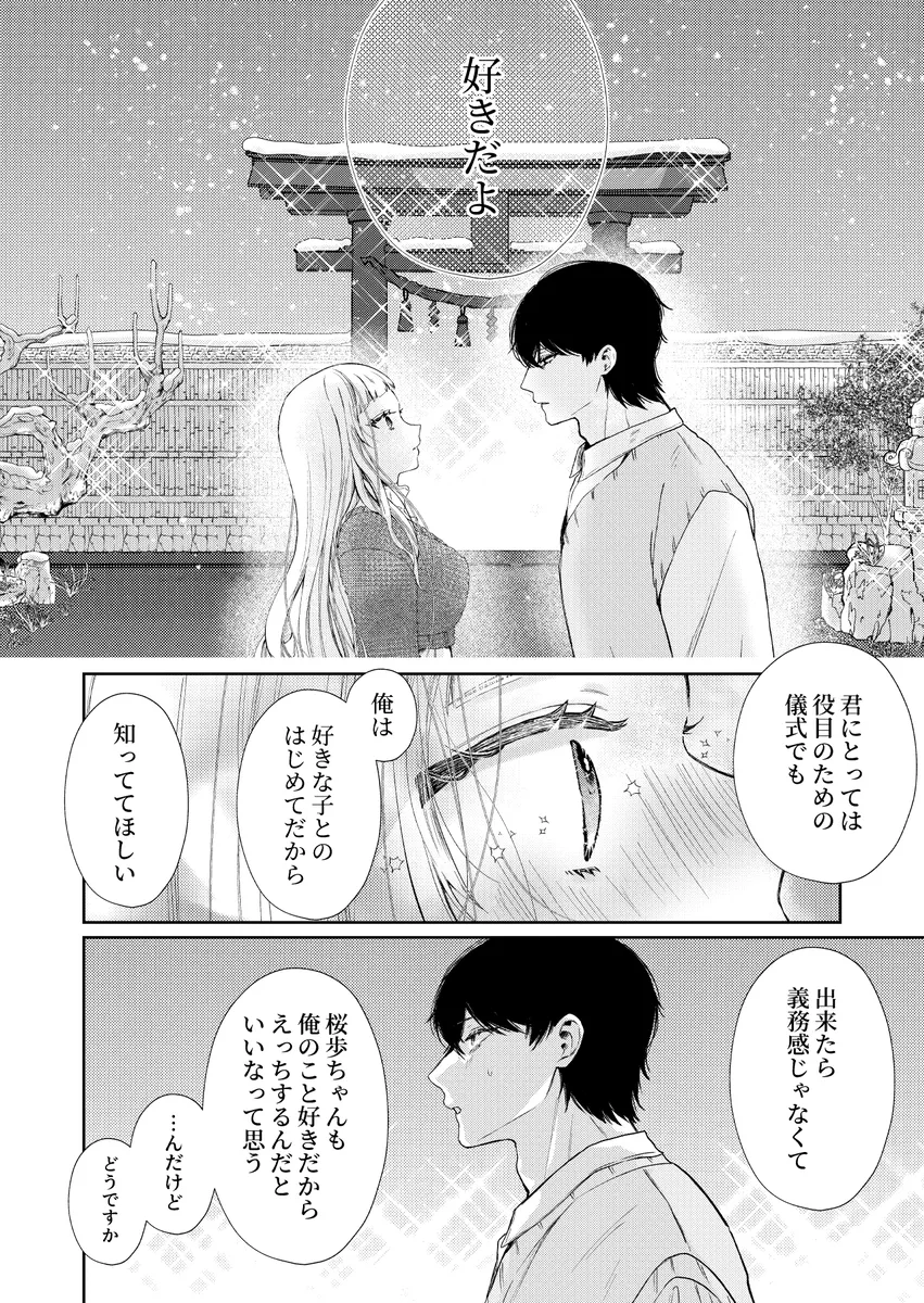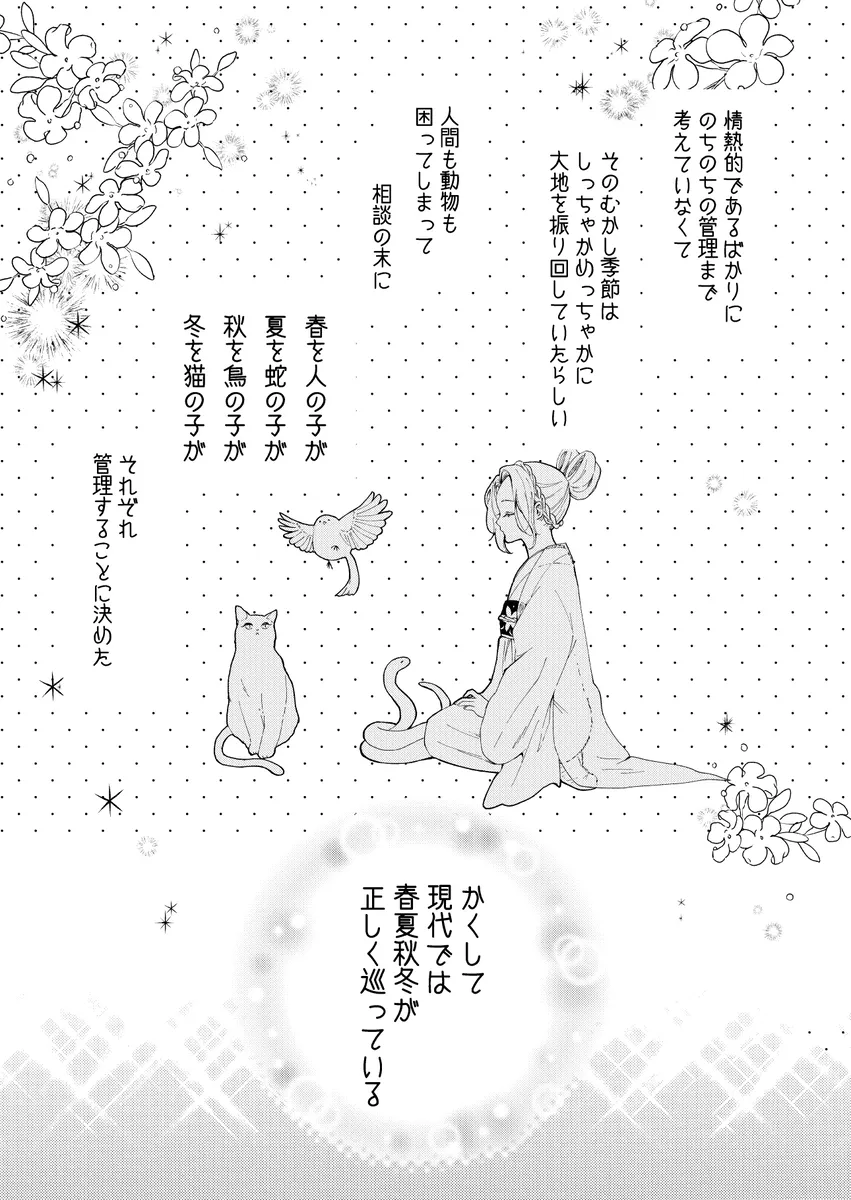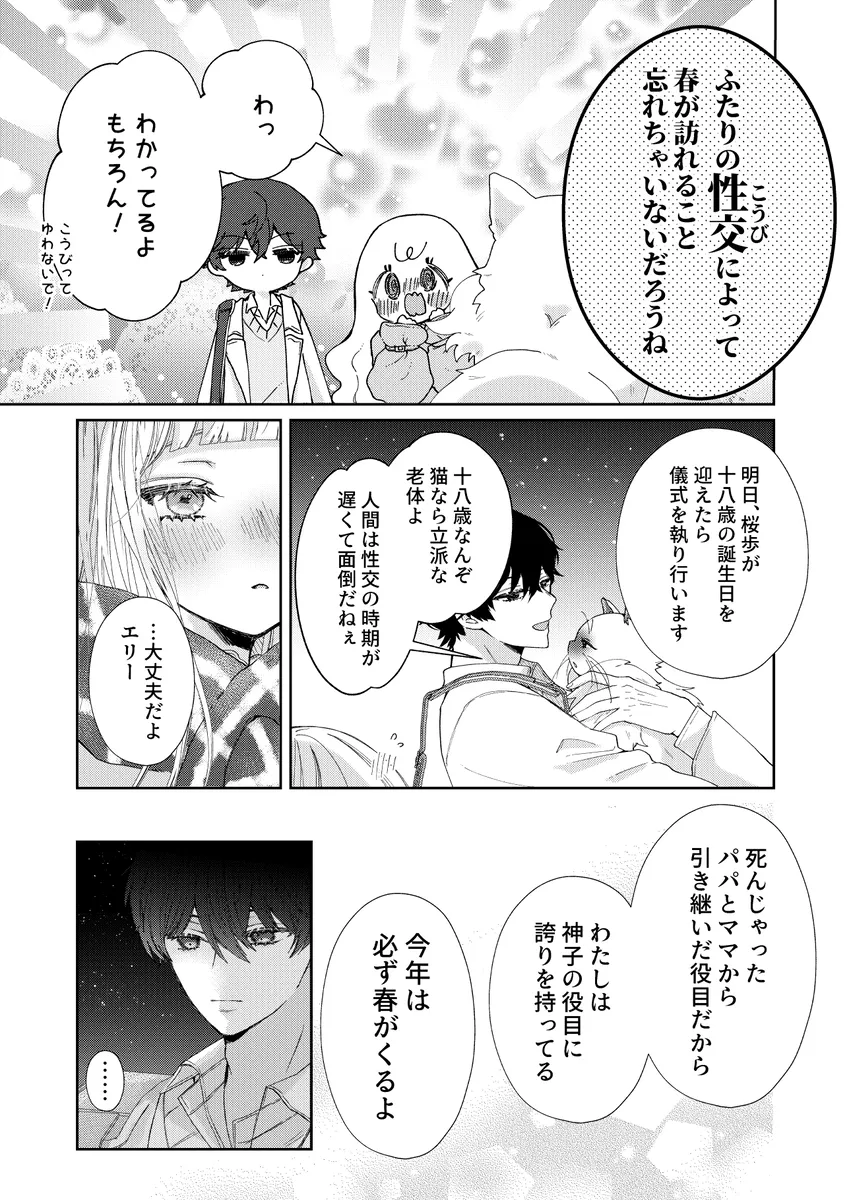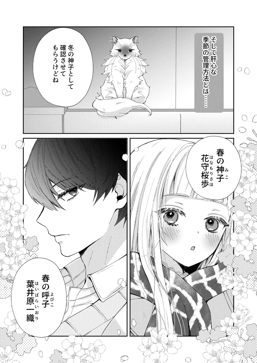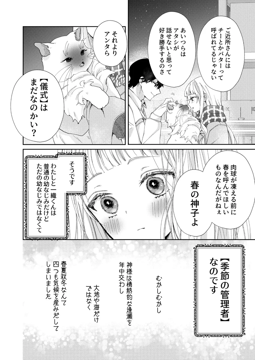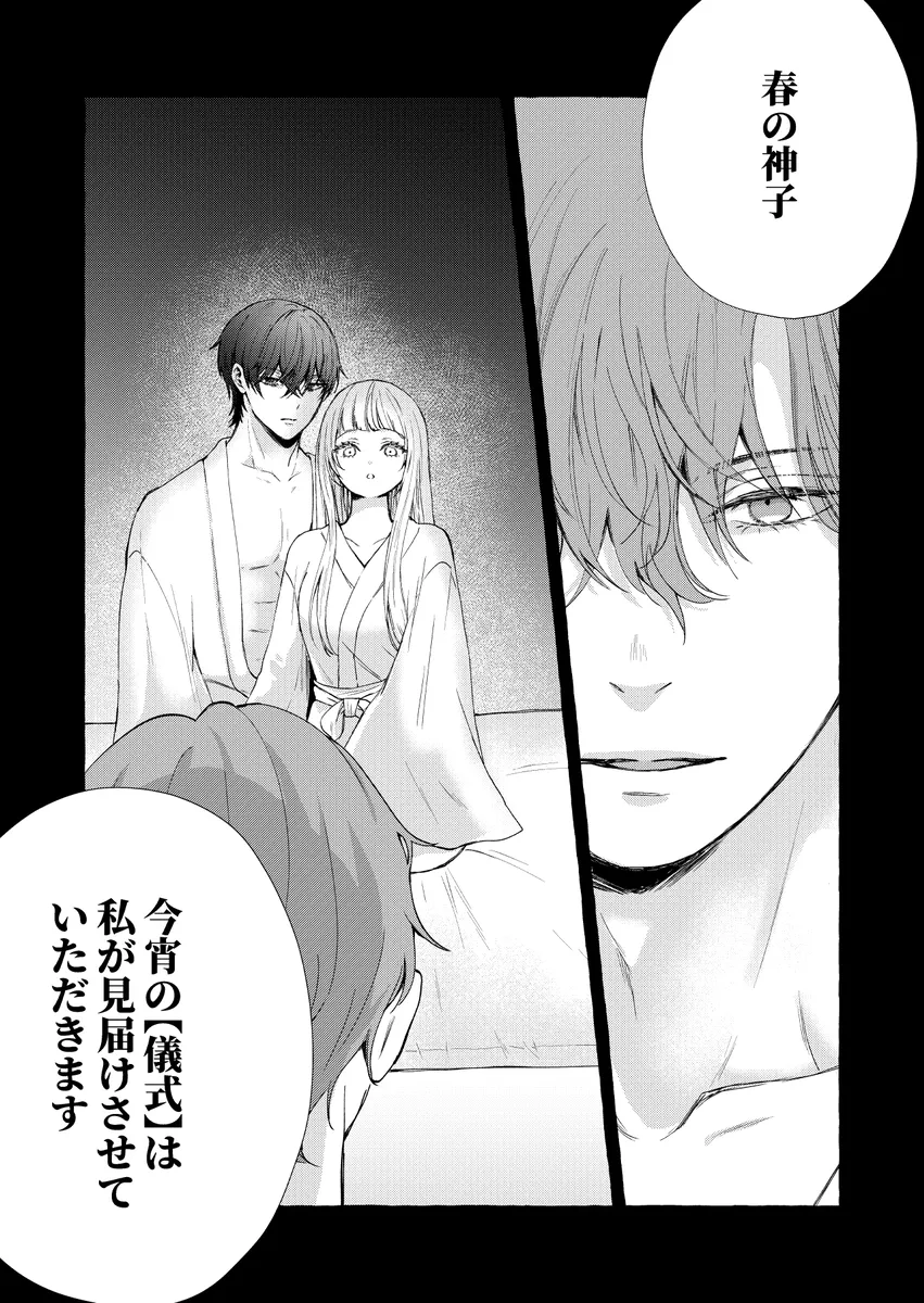 神々の情熱が生んだ四季を、人の子と獣の子が分担して司る世界。春を任されたのは、“花守”の家系に生まれた少女・桜歩だった。けれど春の力は、ただ待つだけでは満ちない。季節を巡らせるためには、“春の呼び子”との特別な儀式が必要――それは、想い合う二人が心も体も重ねることで、春を目覚めさせるというもの。相手に選ばれたのは、幼い頃から一緒に育った一織。ずっと隣にいたはずの彼を、桜歩は“ただの幼なじみ”ではいられない存在として意識し始める。雪の残る町で再会した二人は、世界に春を呼ぶため、そして自分たちの想いを確かめるために、運命の儀式へと踏み出す――。