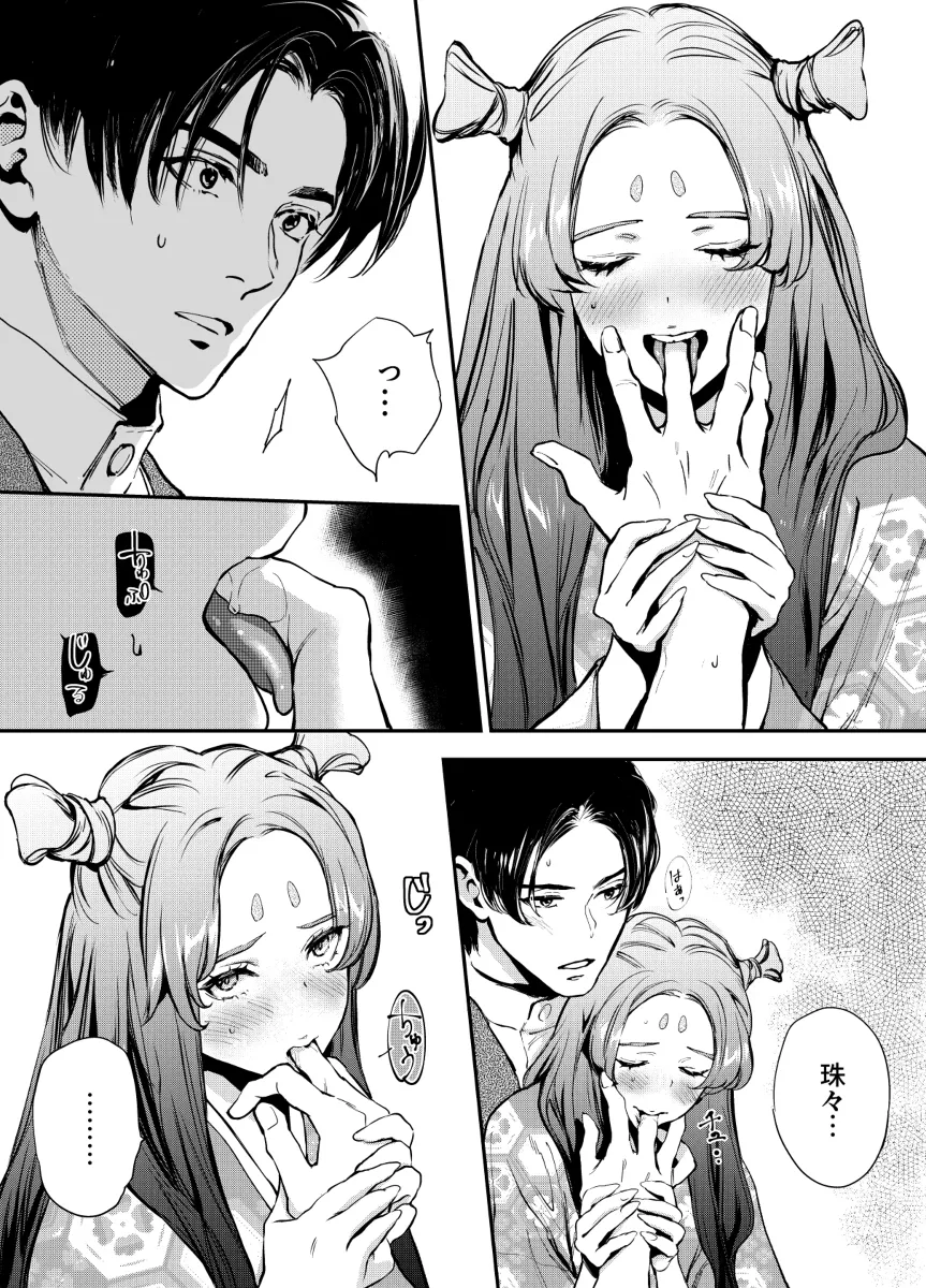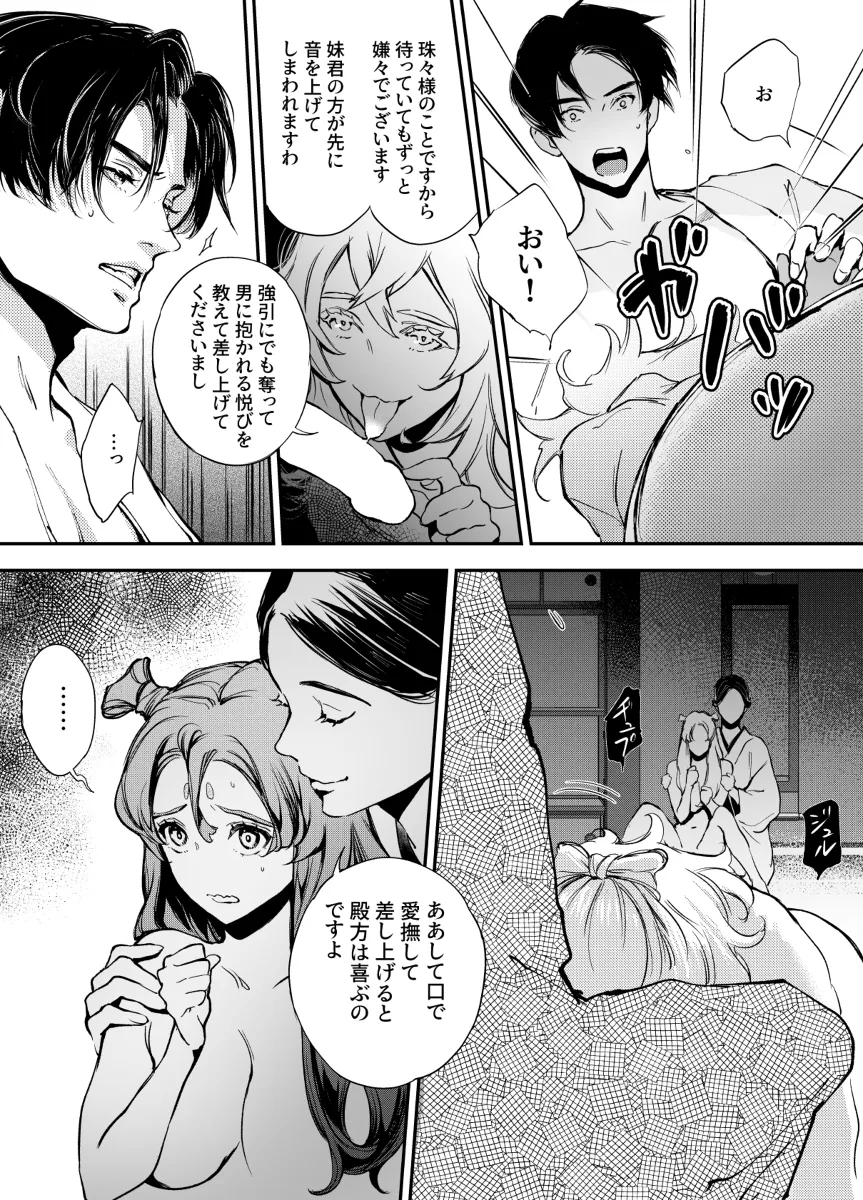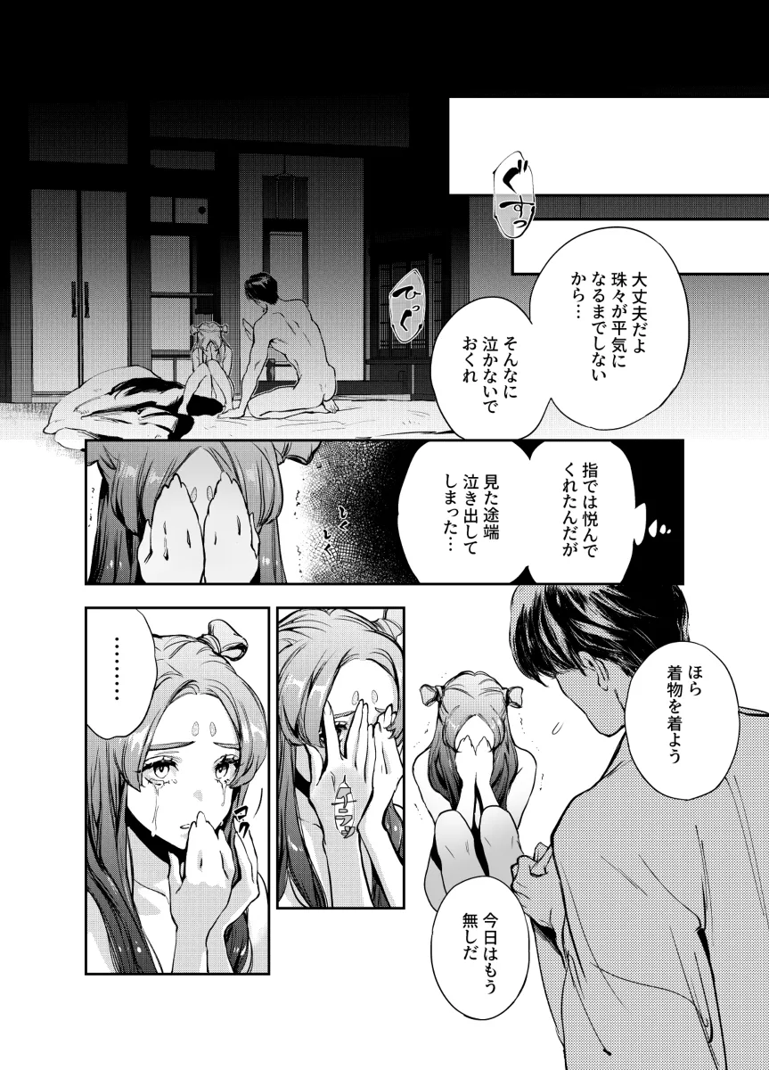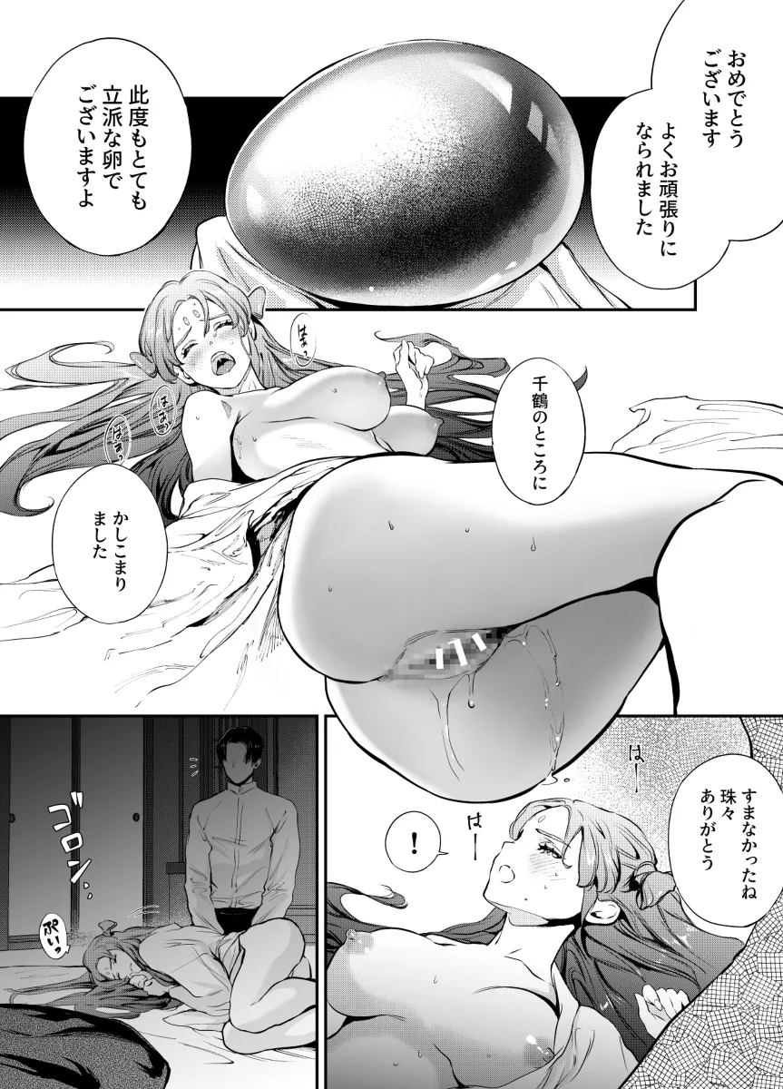商家の若き主・影明(かげあき)は、ある日、深い傷を負い人の世へ落ちてきた異界の王「妖王」を偶然助ける。後日、その礼として影明のもとに遣わされたのは、黄金の卵を産み、あらゆる病を癒す力を持つという天女・珠々(じゅじゅ)だった。死の病に侵された最愛の妹を救うため、影明は珠々の力を借りる決意をする。しかし、卵を産むには人の男と契りを交わさなければならないという残酷な条件があった。妹の命を守るためと自らに言い聞かせながら珠々を抱く影明と、不本意な運命に戸惑いながらも、彼の優しさに触れるたび心を揺らしていく珠々。繰り返される契りの中で、二人は単なる“救いのための関係”ではいられなくなっていく。命を救うための行為が、やがて互いを想う真実の感情へと変わっていくとき、影明と珠々はそれぞれの運命と向き合うことになる――。