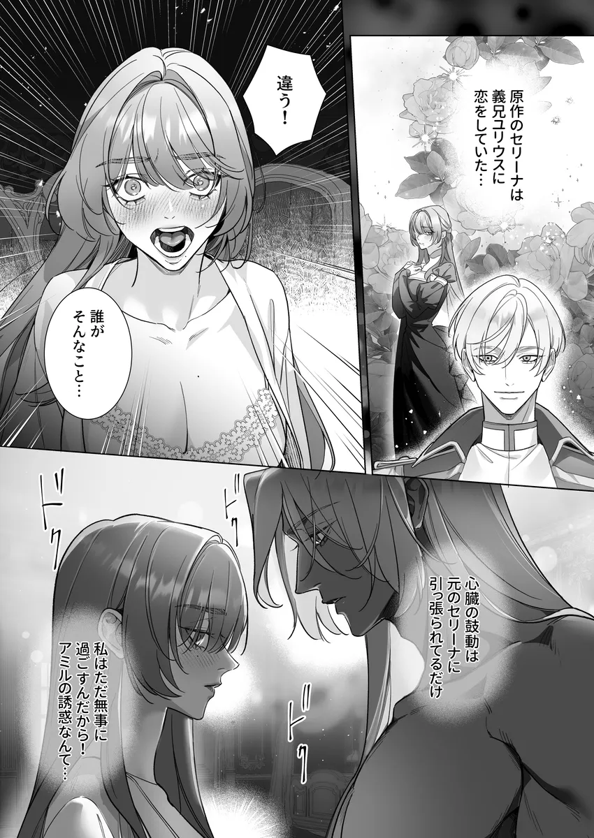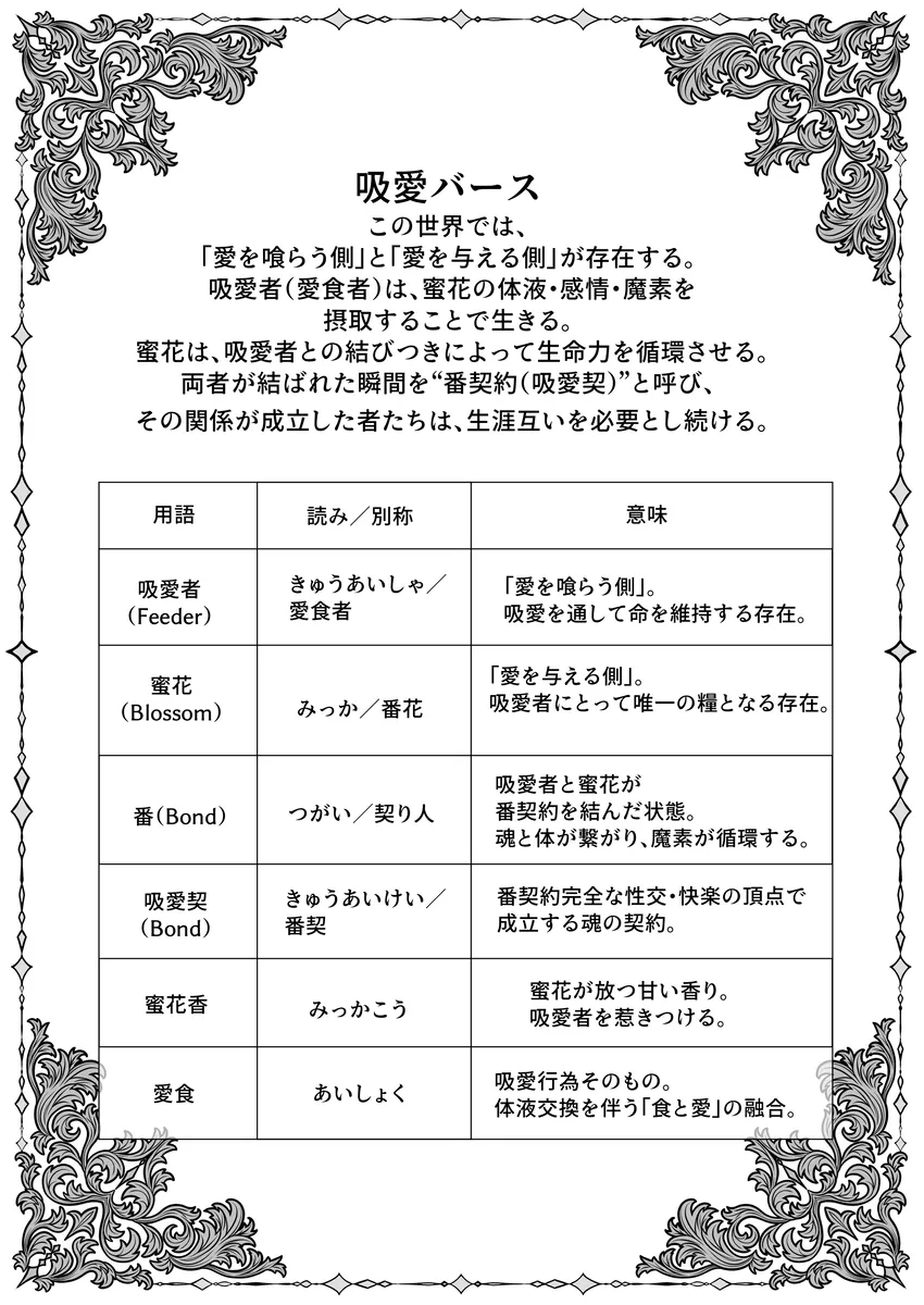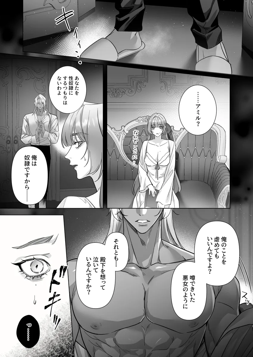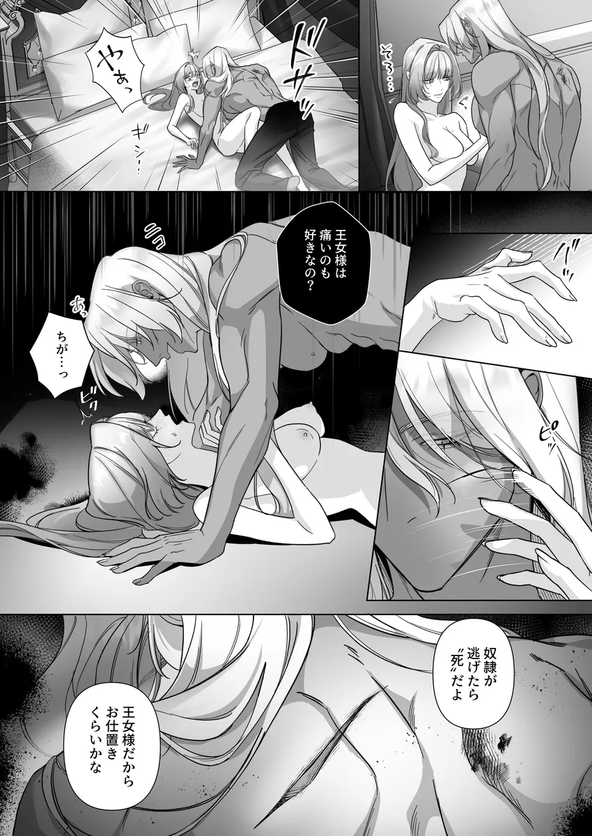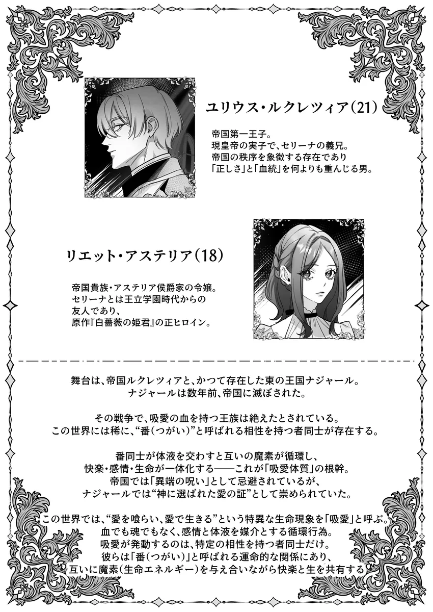 ロマンス小説『白薔薇の姫君』の世界に転生してしまった少女・セリーナ。目覚めたとき、彼女は物語の中で“悪女”として処刑される運命を持つ王女になっていた。破滅の未来を避けるため、原作の流れを変えないよう慎重に生きようと決意する。そんな中、セリーナは奴隷として売られていた青年アミルと出会い、思わず彼を救ってしまう。しかしアミルは、帝国に滅ぼされた国の出身で復讐心を抱える危険な男だった。さらにこの世界には、互いの体液や感情を通じて生命力を循環させる「吸愛(きゅうあい)」という特殊な関係が存在し、特定の相手同士が結ばれると強い絆が生まれるという。セリーナとアミルは次第に強く惹かれ合い、逃れられない関係へと近づいていく。運命を変えたい王女と、復讐を抱える奴隷青年。愛と支配、そして欲望が交差する中で、二人の関係は危うくも深く結びついていく――。